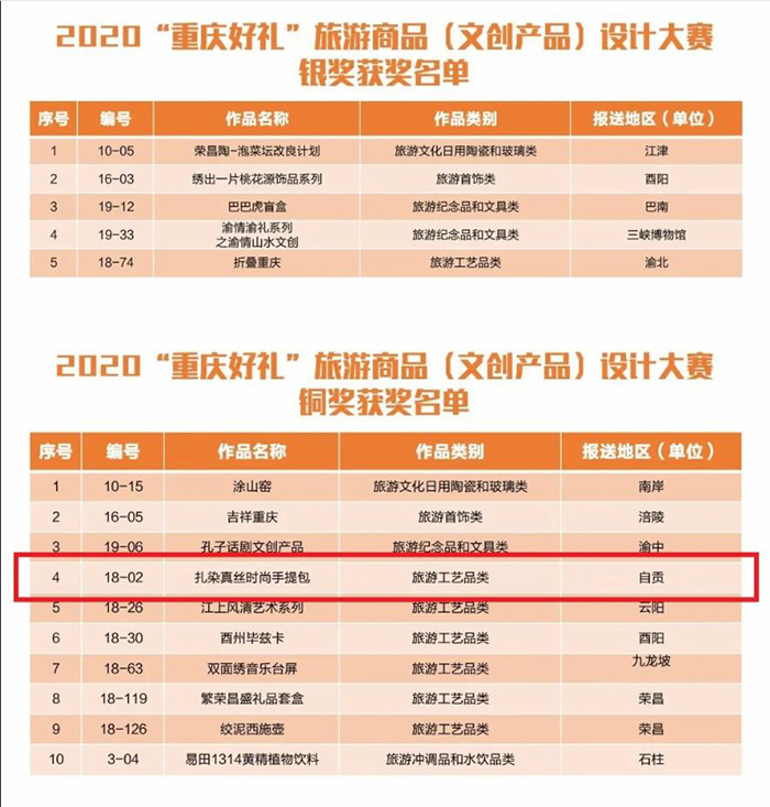 四川鸿山集团旗下国家级非遗保护单位-自贡市扎染工艺有限公司-"蜀颉扎染创新团队"自主研发的山茶花系列"扎染真丝时尚手提包"从270家企业500余套1000余件旅游商品(文创产品)中脱颖而出,获得本届文创产品设计大赛“铜奖”。是本次自贡市参赛团及四川省参赛团唯一获得“旅游商品(文创产品)设计大赛”奖项的企业。